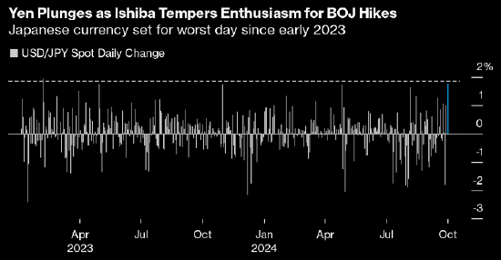 日元遭遇两年多来最大单日跌幅,此前日本新任首相石破茂称经济还没有为进一步加息做好准备,导致汇市巨震。