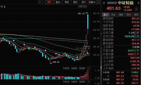 权益市场回暖的情绪也传导到了转债市场。近期,转债市场行情明显走强,自9月24日以来,中证转债指数最大反弹幅度超15%,今日盘中最高攀升至421.12点,创2022年9月以来新高。与此同时,转债市场的成交量也在急剧增加,9月23日,转债市场的成交额约为279亿元,10月8日已攀升至1524.39亿元。