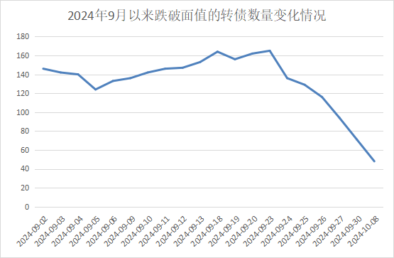 不过,随着近期权益市场回暖,转债“破净”局面得到改善。截至10月8日收盘,跌破面值的转债数量已收缩至48只,相对9月23日的165只,减少了70.91%。