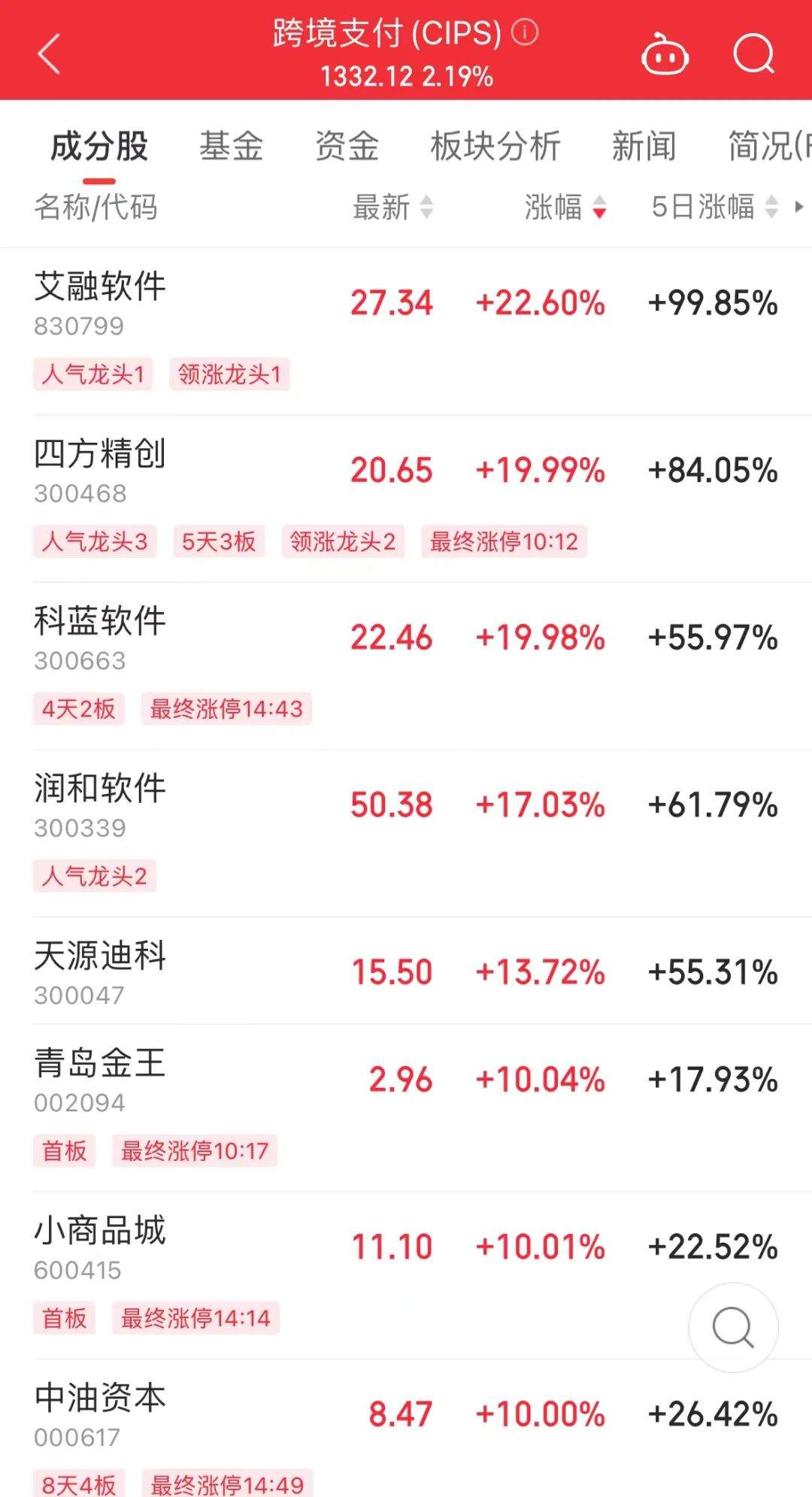 盘面上,跨境支付概念逆市走强,四方精创(300468)、小商品城(600415)、京北方等多股涨停。