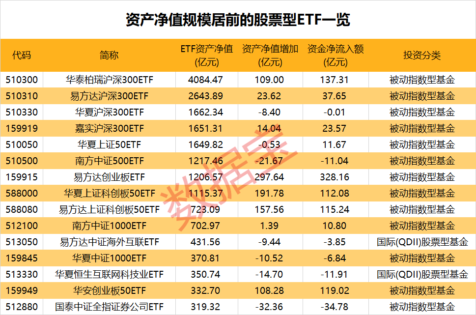 全市场资产净值300亿元以上ETF基金共计15只,1000亿元以上有8只。其中,华泰柏瑞沪深300ETF规模居首,最新为4084.47亿元;易方达沪深300ETF排于次席,最新规模2643.89亿元。