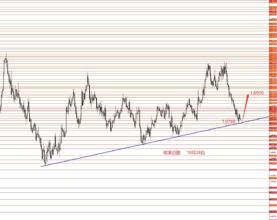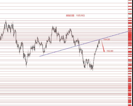 10月28日,上周美指继续冲高,最高104.50附近周图收阳柱。从图形来看,从100.10涨上来这波远超出我的预期,已经太高,加上本周收月线,故本周建议逢高做空美指。保者守可等待顶部给出向下信号后再场做空,激进者操作建议:104.50附近做空,止损104.80,目标看向104.20和103.90,再看向103.60和103.20和102.80附近。控制仓量,严格止损。