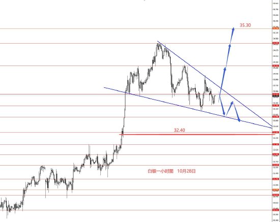 白银上周冲高回落,目前四小时级别在高位向下楔形整理,从图形来看,后市32.40以上趋势还是偏多头,只是不确定修整行情完结了没有,本周初先关注楔形区间看如何破位吧,然后再走一步看一步。