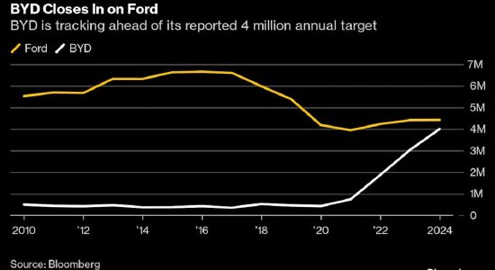 在第三季度营收首次超过电动汽车竞争对手特斯拉之后,比亚迪有望在另一项指标上赶超传统汽车巨头福特。