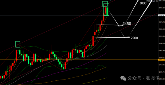 但如维持在5月均线之上,多头则仍有再度攀升的机会。反之如跌破5月均线后,将等待触及2450美元或2200美元附近再度入场并直接上看3000美元。