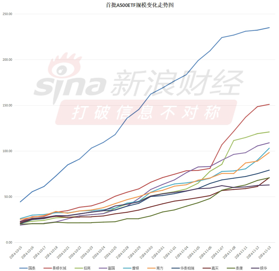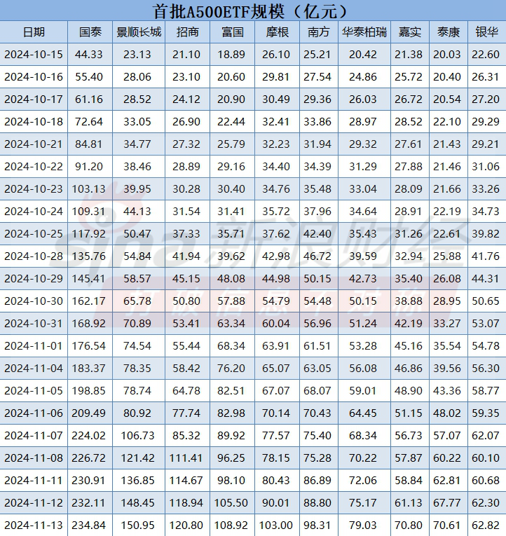 泰康A500ETF(560510)从上市到11月6日,基本上都是规模垫底的存在,但是自从11月7日以后,经常超越嘉实和银华,目前泰康和嘉实两只产品规模相近比较胶着。