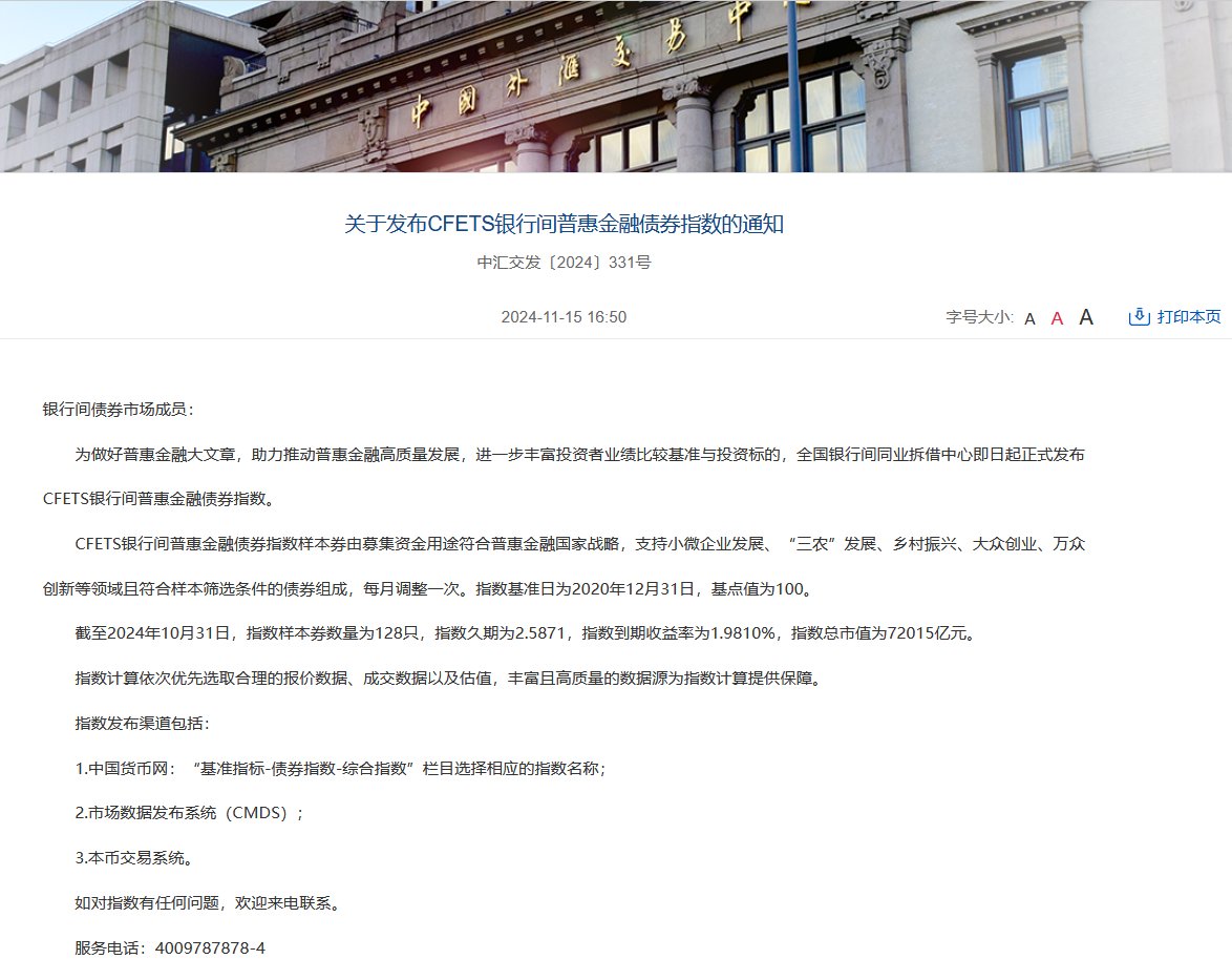 11月15日金融一线消息,全国银行间同业拆借中心今日发布关于发布CFETS银行间普惠金融债券指数的通知。通知指出,为做好普惠金融大文章,助力推动普惠金融高质量发展,进一步丰富投资者业绩比较基准与投资标的,全国银行间同业拆借中心即日起正式发布CFETS银行间普惠金融债券指数。