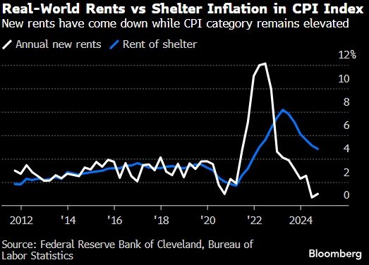 住房是CPI中最大的一个类别,贡献了10月份CPI涨幅的一半以上。如果像克利夫兰联储预测的那样再保持高企一年半时间,将对那些以通胀进展为降低利率主要依据的决策者构成挑战。