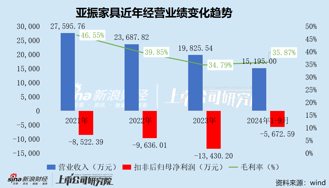 2024年1-9月,家具市场整体回暖的背景下,亚振家具仍未能扭亏,亏损状态从2018年一直持续至今,已达7年之久。1-9月,亚振家具实现营业收入1.52亿元,同比微增1.4%;实现扣非后归母净利润-5672.59万元,同比减亏23.86%。