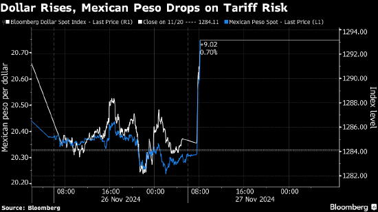 这位当选总统在社群媒体网站Truth Social上承诺要对墨西哥等一系列国家征收更多关税,这是他自11月5日赢得大选以来首次针对贸易发出具体的威胁,投资者由此见证到这种市场波动的滋味。