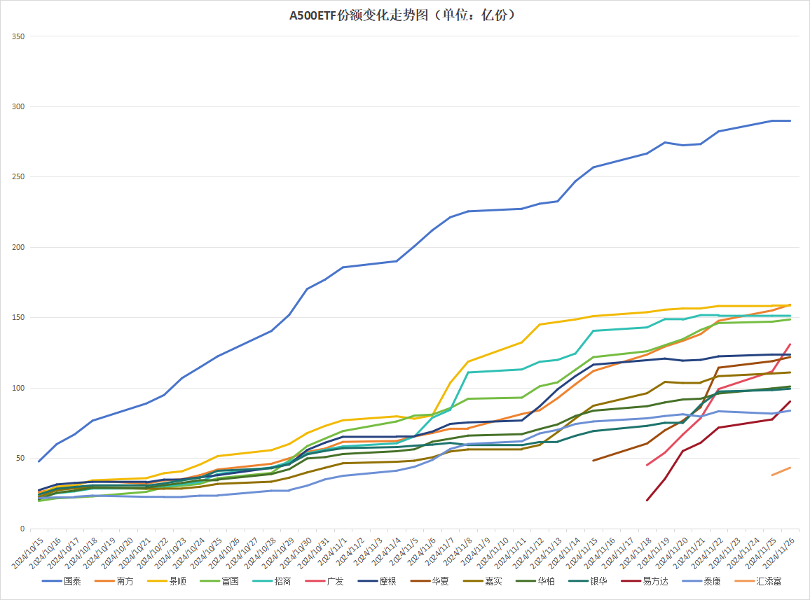 从份额看,数据显示,11月15日景顺长城A500ETF(159353)就达到了150亿份,此后8个交易日,一直在150亿份至160亿份之间,增速显著降低。与此同时,南方基金旗下南方中证A500ETF(159352)昨日(11月26日)最新份额为159.03亿份,超越了景顺长城A500ETF(159353)。