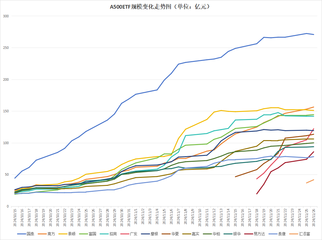 从规模看,景顺长城A500ETF(159353)在11月13日就突破150亿元,当天,南方中证A500ETF(159352)规模仅98亿元;但是随后,南方基金猛然发力,规模增速显著快于景顺长城,到11月25日、26日,南方A500ETF规模已经持续超越了景顺长城A500ETF。