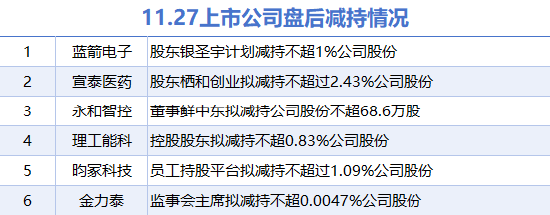 据统计,11月27日,盘后包括蓝箭电子、宣泰医药、永和智控、理工能科、昀冢科技、金力泰(维权)在内的6家A股上市公司披露减持情况。