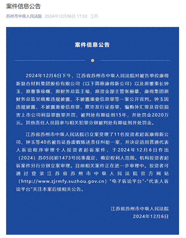 2024年12月6日下午,江苏省苏州市中级人民法院对被告单位康得新复合材料集团股份有限公司(以下简称康得新公司)以及原董事长钟玉、原董事徐曙、原财务总监王瑜、原资金部主管张丽雄、康得集团原财务总监吴晓雁违规披露、不披露重要信息罪等一案公开宣判。钟玉因违规披露、不披露重要信息罪、欺诈发行证券罪、骗购外汇罪及背信损害上市公司利益罪数罪并罚,被判处有期徒刑15年,并处罚金2020万元。其他责任人员因参与相关犯罪分别被判处有期徒刑并处罚金。
