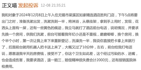 首旅如家酒店花洒现粪便痕迹,消费者要求退一赔三,酒店:只能退一其他我没有权限