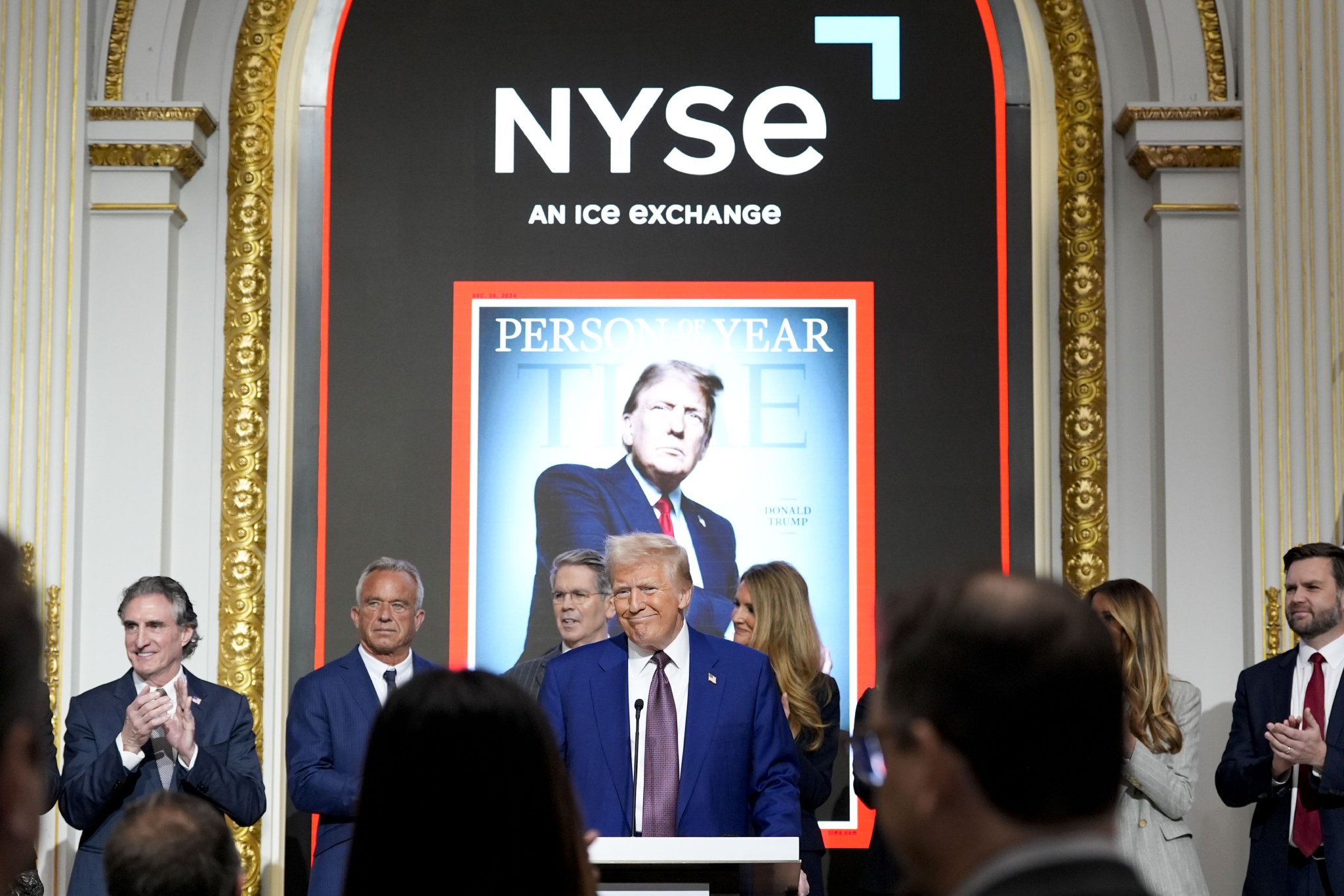 美国当选总统唐纳德·特朗普敲响纽约证券交易所周四的开盘钟声。当日,他被《时代》周刊二度评为“年度人物”。据悉,他是罗纳德·里根之后首位在纽交所“敲钟”的候任总统。
