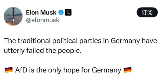 马斯克:德国传统政党让德国人民“极度失望”