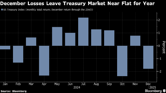 根据指数,截至12月23日,美国国债本月累计下跌1.8%,年迄今涨幅收窄至0.3%。截至9月17日,也就是美联储降息的前一天,该指数今年累计上涨约4.6%。去年美国国债上涨4.1%,2022年和2021年分别下跌12.5%和2.3%。
