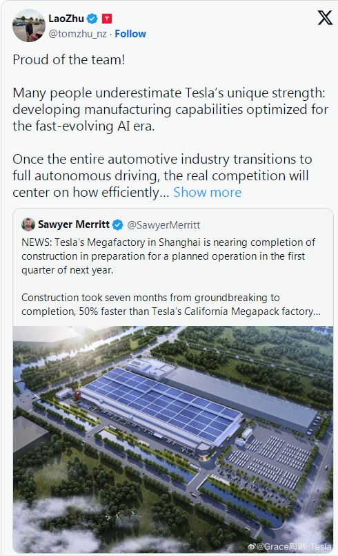 朱晓彤是在回应电动汽车分析师索耶·梅瑞特的一条关于特斯拉上海储能超级工厂即将竣工,并计划于明年一季度投入运营的帖子。梅瑞特写道:“这座工厂从破土动工到竣工仅用了7个月,比特斯拉在加州的Megapack工厂建设速度快了50%。”