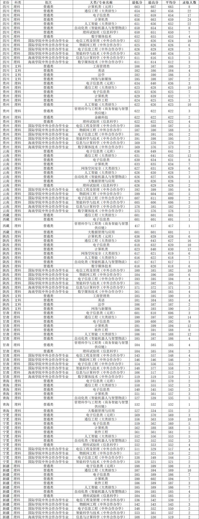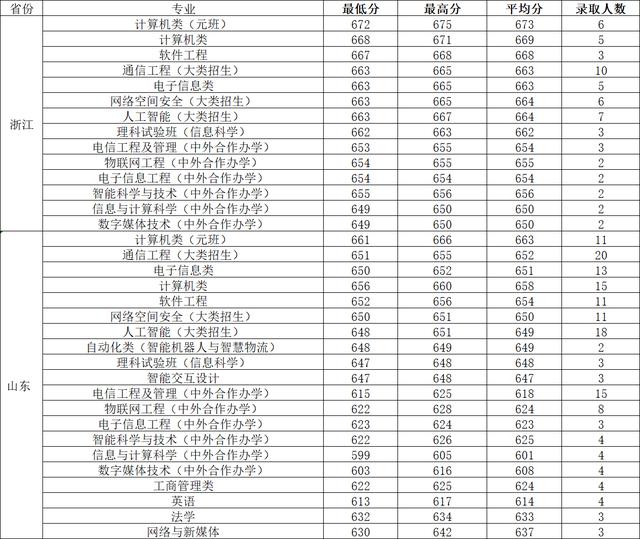 在一批科技录取分数线较高的本科专业:计算机(元班)663分,计算机656分,通信工程(大类招生)654分,最低650分。文科专业录取分数线:工商管理586分,英语582分,法学582分,网络和新媒体595分。