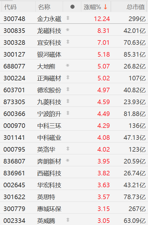 A股稀土永磁板块拉升,金力永磁涨12%,银河磁体、九菱科技、西磁科技涨4%!马斯克:特斯拉正与中国合作稀土