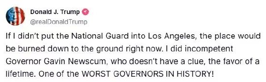美国总统特朗普在Truth Social发文称:“如果我没有把国民警卫队部署到洛杉矶,这个地方现在早就被烧成平地了。我帮了无能的州长加文・纽森一个此生难忘的忙——他根本毫无头绪,简直是美国历史上最差劲的州长之一!”