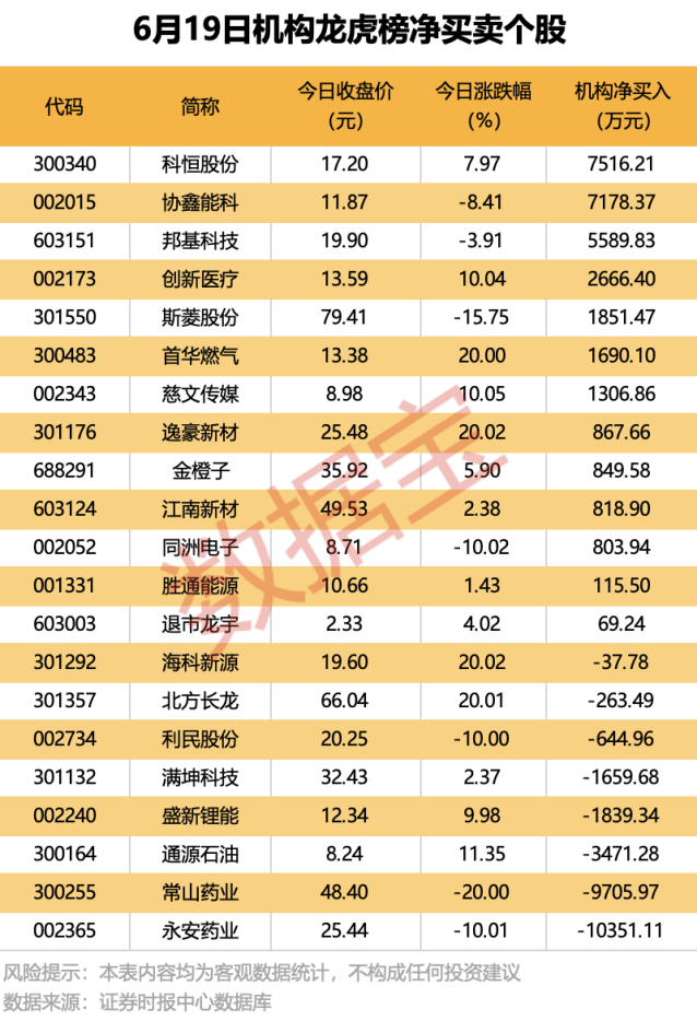 今日龙虎榜中,共7股获机构净买入超千万元,科恒股份(300340)获机构净买入7516.21万元,居首;其次是协鑫能科(002015)、邦基科技,均获净买入超5500万元。