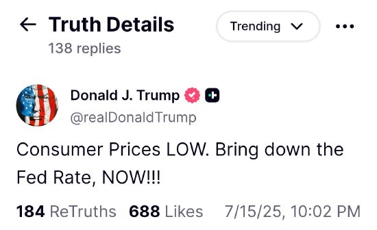 美国总统特朗普称,消费者价格“低”,美联储应该“现在”降息。