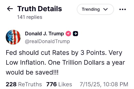 他还在另外一个帖子中表示,美联储应该降息3个点,通胀非常低。