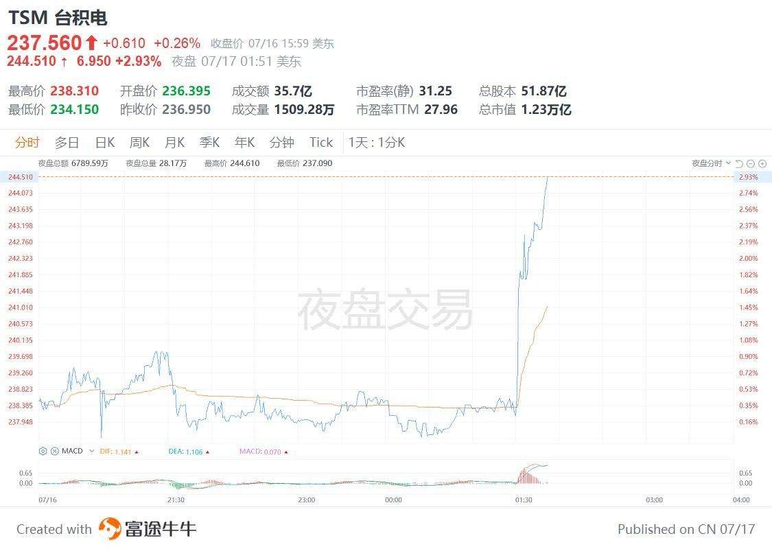 台积电夜盘拉升涨近3%,Q2净利暴增60%创历史新高!主要得益于人工智能应用领域对半导体需求的激增