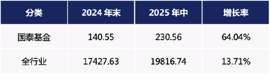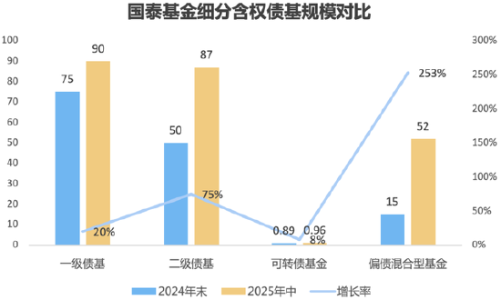 相比之下,2025年上半年,国泰基金各类型含权债基产品规模增速表现均优于同类平均。尤其是偏债混合基金,在全行业规模下降的背景下,国泰基金相关产品规模依然显著上涨。