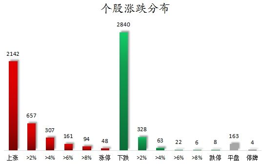 个股涨跌情况,截至收盘,沪深两市合计2142只个股上涨,2840只个股下跌,平盘个股163只,停牌的个股4只。不含当日上市新股,共有48只个股涨停,8只个股跌停。