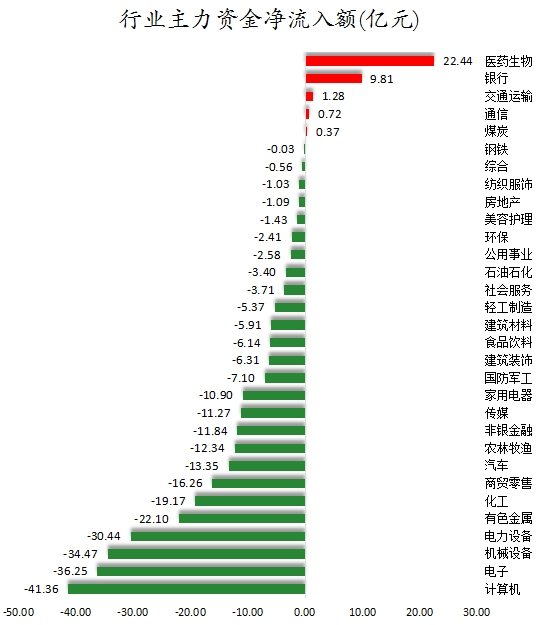 从行业来看,申万所属的31个一级行业,今日有5个行业主力资金呈现净流入,其中,医药生物行业主力资金净流入最多,净流入金额为22.44亿元;行业主力资金净流入居前的还有银行、交通运输等,净流入金额分别为9.81亿元、1.28亿元。26个行业主力资金呈现净流出,其中,计算机行业主力资金净流出最多,净流出金额为41.36亿元;行业主力资金净流出靠前的还有电子、机械设备、电力设备、有色金属、化工、商贸零售等,净流出金额分别为36.25亿元、34.47亿元、30.44亿元、22.1亿元、19.17亿元、16.26亿元。