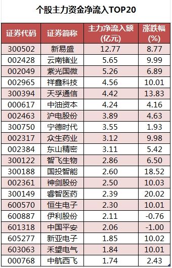 个股来看,今日有1989只个股获主力资金净流入,其中,43股获主力资金净流入超1亿元。新易盛(300502)主力资金净流入最多,净流入金额为12.77亿元;主力资金净流入居前的个股还有云南锗业(002428)、紫光国微(002049)、祥鑫科技、天孚通信(300394)、中油资本(000617)等,净流入金额分别为5.65亿元、5.26亿元、4.56亿元、4.42亿元、4.24亿元。
