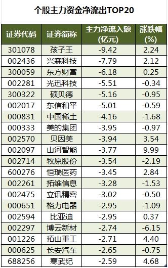 今日有3156只个股被主力资金净卖出,其中,87股被主力资金净卖出超1亿元。主力资金净流出最多的个股是孩子王,净流出金额为9.42亿元;主力资金净流出居前的个股还有兴森科技(002436)、东方财富(300059)、光迅科技(002281)、硕贝德(300322)、东信和平(002017)等,净流出金额分别为7.79亿元、6.18亿元、5.51亿元、5.16亿元、5.01亿元。