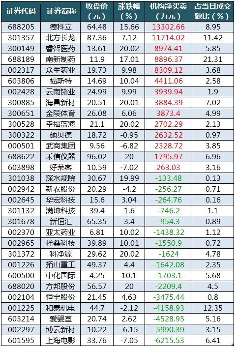 盘后龙虎榜数据显示,今日机构席位资金合计净买入约4.01亿元。其中,净买入的个股14只,净卖出的个股16只。机构净买入最多的股票是德科立,净买入金额约1.33亿元;机构净买入居前的还有北方长龙、睿智医药、南新制药等股。机构净卖出最多的股票是上海电影,净卖出金额约6215.53万元;机构净卖出居前的还有博云新材(002297)、爱婴室(603214)、和泰机电等股。