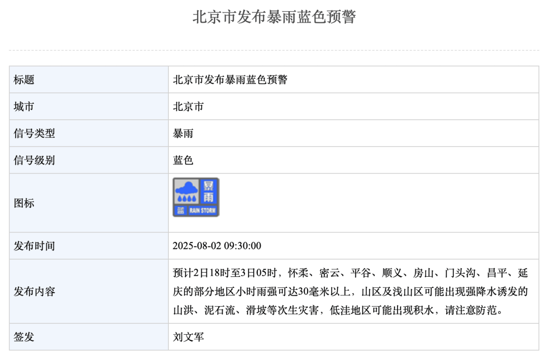 9时30分,北京市发布暴雨蓝色预警:预计2日18时至3日05时,怀柔、密云、平谷、顺义、房山、门头沟、昌平、延庆的部分地区小时雨强可达30毫米以上,山区及浅山区可能出现强降水诱发的山洪、泥石流、滑坡等次生灾害,低洼地区可能出现积水,请注意防范。