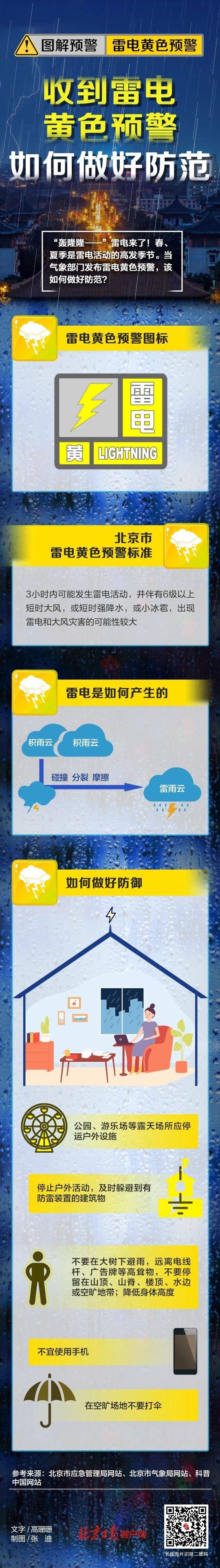 8月2日9时30分,北京市发布雷电黄色预警:预计8月2日14时至3日06时,北京有雷电活动,局地伴有短时强降水和7级左右短时大风,请注意防范。
