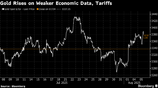 美国总统唐纳德·特朗普的贸易冲突以及围绕其给俄罗斯总统弗拉基米尔·普京设定的最后期限的紧张局势,也为金价上涨提供了动力。