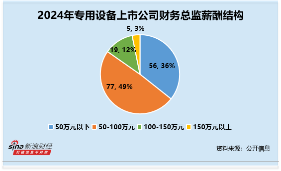 分行业来看,机械设备-专用设备行业(申万二级行业)上市公司财务总监CFO 2024年薪酬平均数约为65.56万元。其中薪酬最高为蓝英装备余之森,2024年薪酬高达320.1万元;薪酬最低为天地科技王志刚,2024年薪酬为9.41万元(统计剔除了未完整领取2024年全年薪酬的财务总监CFO)。从整体薪酬分布来看,薪酬在50-100万元人数最多,共计77人,占比49%。