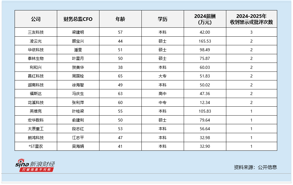 从违规情况来看,行业内共有14名财务总监CFO在2024-2025年收到过警示函、公开通报或内部通报的情况。