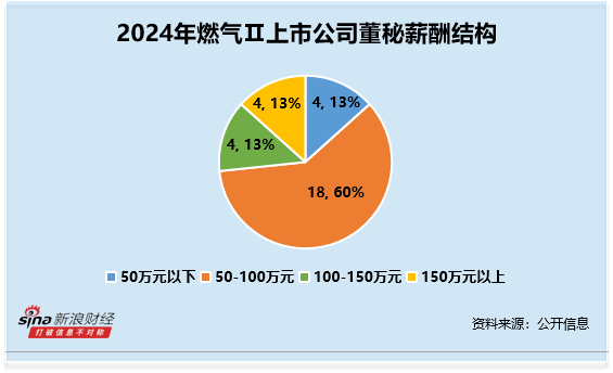 分行业来看,公用事业-燃气Ⅱ行业(申万二级行业)上市公司董秘2024年薪酬平均数约为86.27万元。其中薪酬最高为大众公用赵飞,2024年薪酬高达200.1万元;薪酬最低为胜通能源宋海贞,2024年薪酬为29.77万元(统计剔除了未完整领取2024年全年薪酬的董秘)。从整体薪酬分布来看,薪酬在从整体薪酬分布来看,薪酬在50-100万元人数最多,共计18人,占比60%。