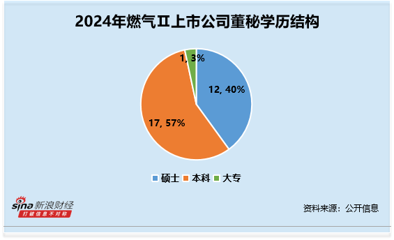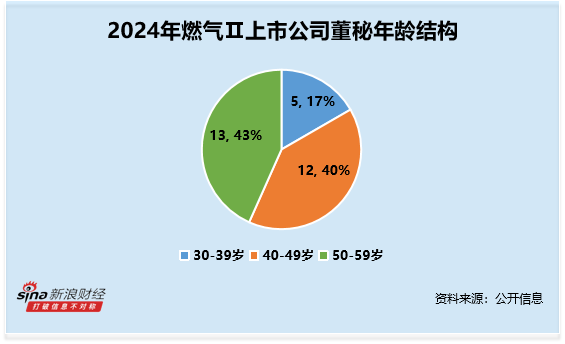 从年龄结构来看,董秘的年龄平均数约为46.8岁,其中50-59岁最多,人数共13人,占比约43%。其中,年龄最大的为陕天然气毕卫,年龄为57岁,2024年薪酬为56.56 万元;年龄最小的为胜通能源宋海贞,年龄为42岁,2024年薪酬为29.77 万元,同为行业内薪资最少。