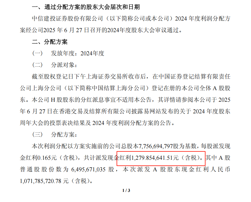 根据公告内容,中信建投证券计划以总股本7,756,694,797股为基数,向全体A股股东每股派发现金红利0.165元(含税),合计应派发现金红利约12.80亿元(含税)。