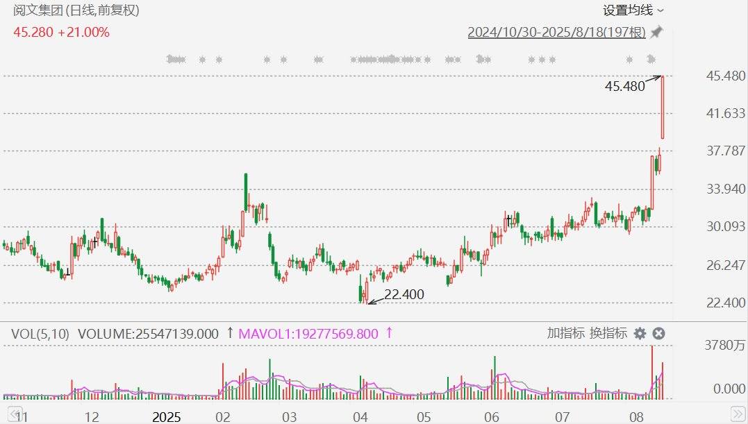 阅文集团(0772.HK)飙升超21%,报45.48港元,股价创2023年3月以来新高。