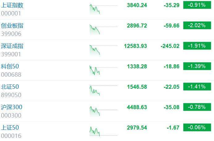 A股主要指数走低,创业板指跌逾2%,深成指跌1.91%,沪指跌0.91%!数字货币、消费电子、算力硬件、军工领跌,4600股下跌