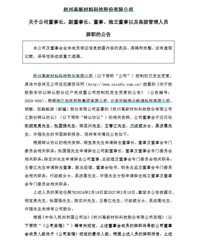 9月4日晚间,杭州高新(300478)(300478)发布公告称,由于公司控制权已发生变更,胡宝泉、张国强、陈亚洲、王春江、付淑威、吴波震、许强等七人因股份转让协议安排申请辞去相关职务。