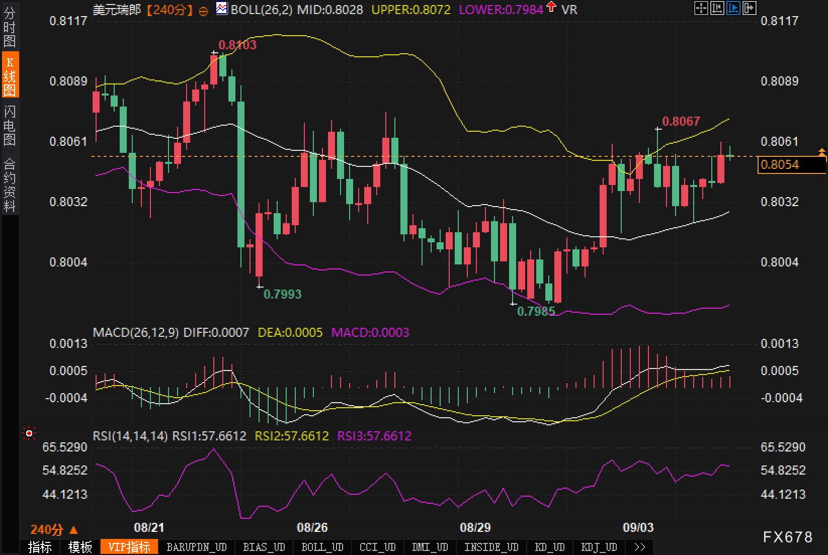 汇通财经APP讯――周四(9月4日)22:00,市场将迎来服务业读数:美国供应管理协会(ISM)8月服务业PMI。围绕这一“催化剂”,美元/瑞郎(USD/CHF)在四小时级别维持震荡偏强,最新K线实体运行在布林中轨0.8028之上、逼近上轨0.8072一线,北美时段于0.8050附近企稳,盘面节奏偏向“数据前的技术性整理”。