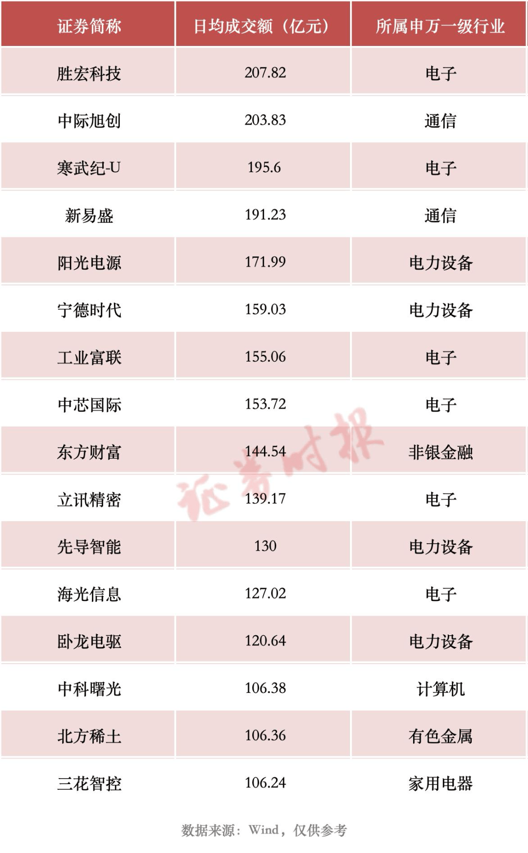 个股方面,据Wind数据,从最近10个交易日的情况来看,有近50只股票日均成交额超过50亿元,其中胜宏科技(300476)、中际旭创(300308)、寒武纪-U、新易盛(300502)、阳光电源(300274)、宁德时代(300750)、工业富联(601138)、东方财富(300059)等16只股票最近10个交易日里日均成交额超过100亿元。这里面,胜宏科技、中际旭创日均成交额更是超过200亿元。