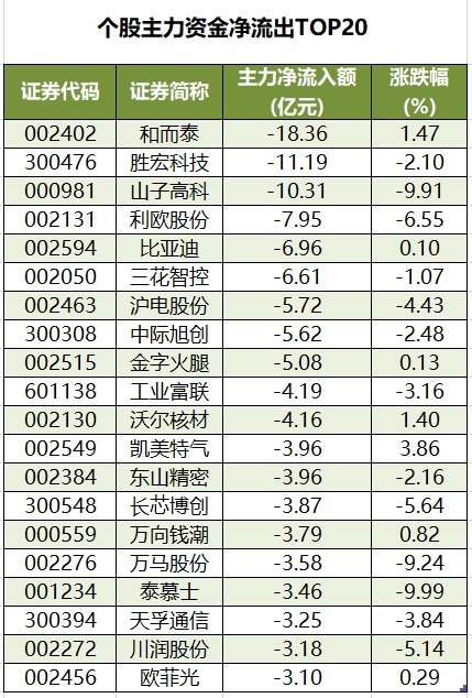 今日有3057只个股被主力资金净卖出,其中,93股被主力资金净卖出超1亿元。主力资金净流出最多的个股是和而泰(002402),净流出金额为18.36亿元;主力资金净流出居前的个股还有胜宏科技(300476)、山子高科、利欧股份(002131)、比亚迪(002594)、三花智控(002050)等,净流出金额分别为11.19亿元、10.31亿元、7.95亿元、6.96亿元、6.61亿元。
